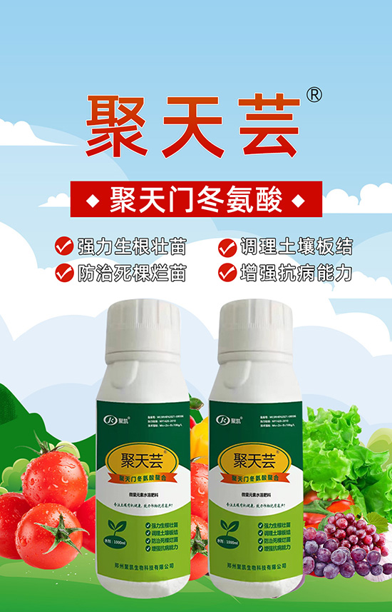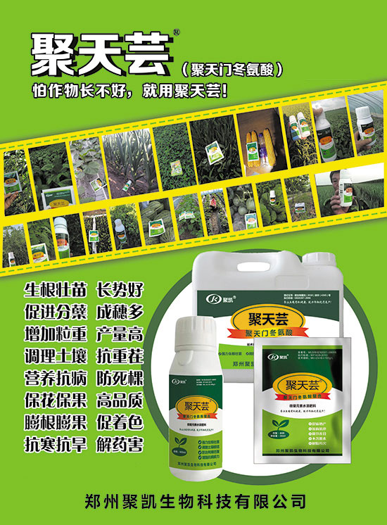 5、提質(zhì)增產(chǎn):聚天蕓能夠促進(jìn)蛋白質(zhì)合成并提高蛋白質(zhì)含量,促早熟、促著色,延長采收期和儲存期,促進(jìn)作物對鈣、鎂、鐵、鋅、錳等中微量元素吸收,不易發(fā)生缺素癥狀。