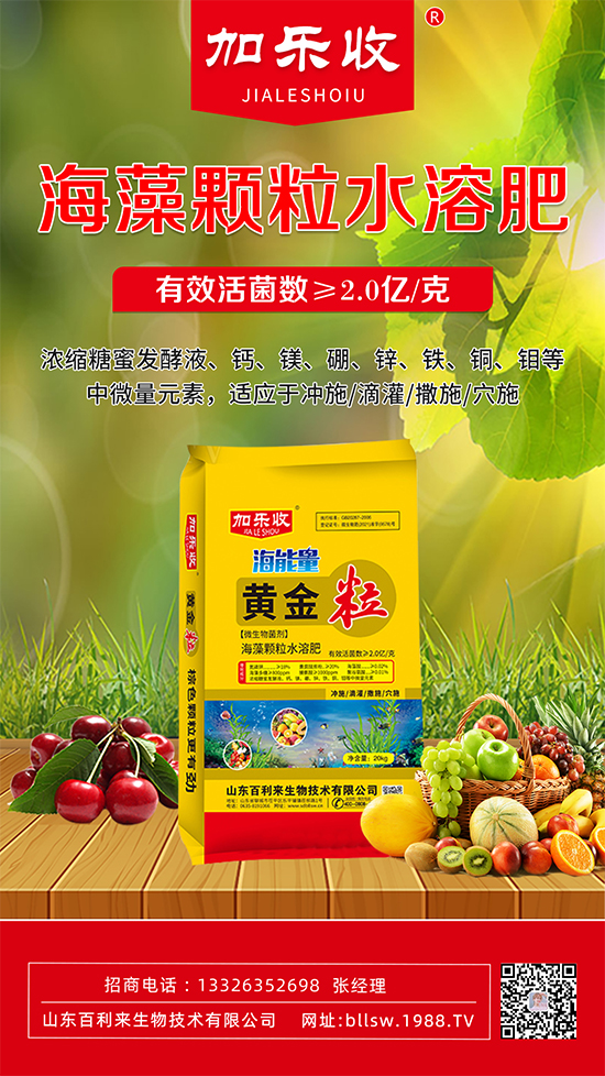 山東百利來生物技術(shù)有限公司【海藻顆粒水溶肥-黃金!渴歉鶕(jù)土壤多年連作重茬種植、施肥嚴(yán)重過量導(dǎo)致的有益菌過度消耗、土壤板結(jié)、鹽漬化,嚴(yán)重影響作物根系對土壤中養(yǎng)分的吸收利用。本品在研制中把氮、磷、鉀、中微量元素進(jìn)行合理配比,特別添加功能性有益菌群、海藻酸、海藻多糖、黃腐酸鉀、脯氨酸、聚谷氨酸等有機(jī)載體,應(yīng)用生物雙螯合技術(shù)螯合而成。