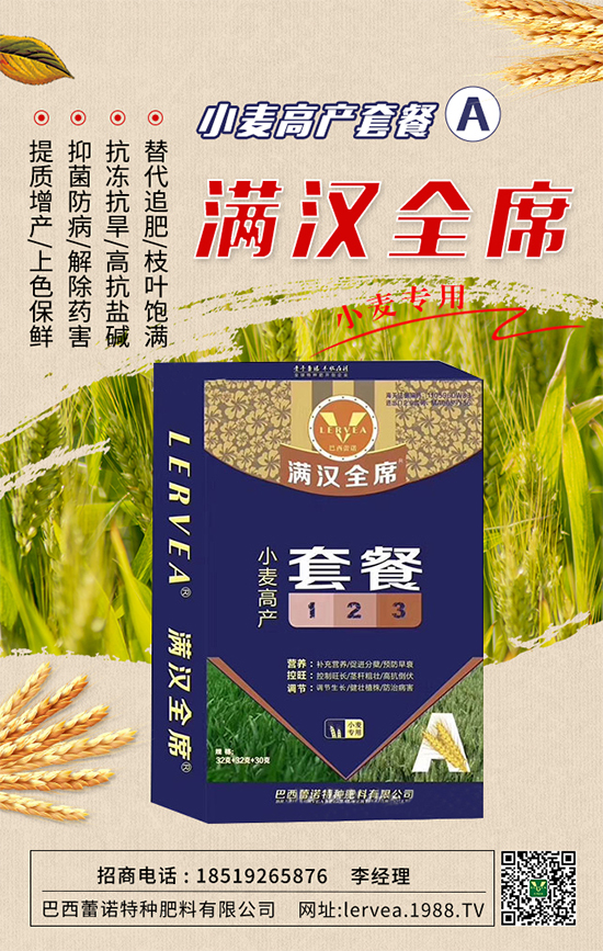 3、抓住小麥返青拔節(jié)的有利時(shí)機(jī),及時(shí)采取促控措施,促進(jìn)弱苗轉(zhuǎn)化,提高成穗率;控制旺長(zhǎng)田塊,預(yù)防后期貪青倒伏。今天,小編為大家?guī)硪豢畎臀骼僦Z特種肥料有限公司的產(chǎn)品--小麥高產(chǎn)套餐A,能夠補(bǔ)充小麥生長(zhǎng)的各種營(yíng)養(yǎng)、調(diào)節(jié)小麥長(zhǎng)勢(shì),提高小麥抗病能力,為小麥高產(chǎn)保駕護(hù)航!