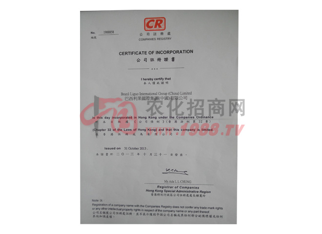 證書名稱:公司注冊(cè)證書    發(fā)證機(jī)構(gòu):香港特別行政區(qū)公司注冊(cè)處