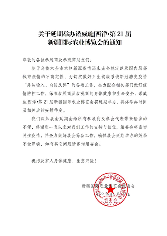 鑒于烏魯木齊市本輪疫情還未完全穩(wěn)定以及國(guó)內(nèi)局部城市疫情的不確定性,為切實(shí)做好衛(wèi)生健康系統(tǒng)疫情“外防輸入、內(nèi)防反彈”的各項(xiàng)工作,全力配合相關(guān)部門做好疫情防控工作,保障參展商及參觀商的身體健康和生命安全,諾威施|西洋·第21屆新疆國(guó)際農(nóng)業(yè)博覽會(huì)將延期舉辦,具體舉辦時(shí)間及相關(guān)后續(xù)安排待定。